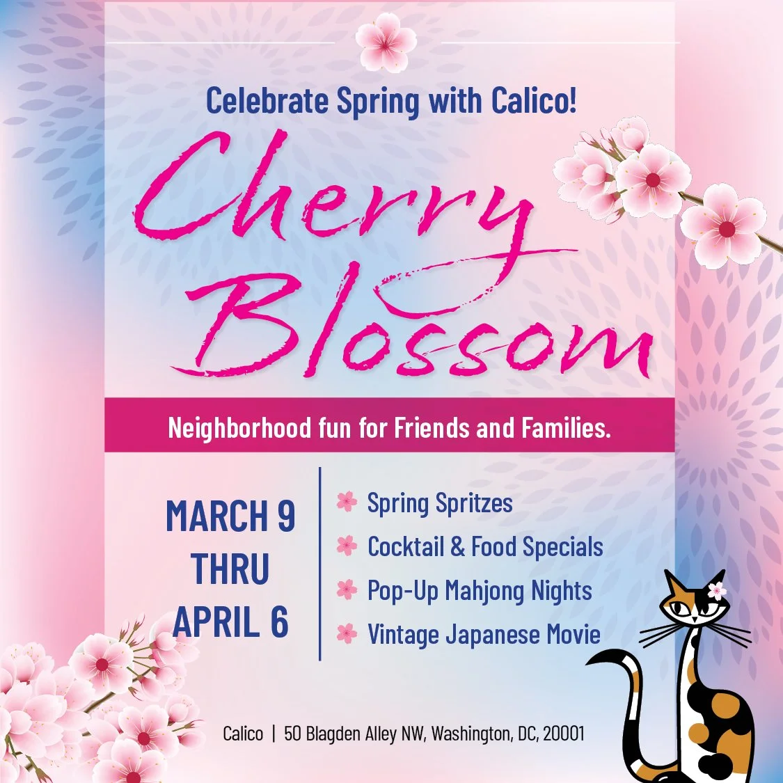 Our “Birdcage in Bloom” pop-up returns from March 10-April 6! Our urban backyard once again celebrates DC’s cherry blossom season, transforming our antique metal greenhouse (nicknamed the “Birdcage”) with pink and white blooms, offering a scenic backdrop for sipping floral cocktails and Japanese spirits!